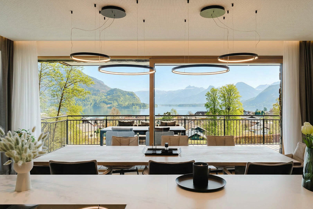 Im herrlichen Salzkammergut, mit Blick über den glitzernden Wolfgangsee entfaltet sich diese sonnige Terrassenwohnung auf rund 163 m² Wohnnutzfläche - hier erwartet Sie ein Zuhause, das keine Wünsche offenlässt. Großzügige Glasfronten holen die Natur ins Innere, während lichtdurchflutete Räume, edle Materialien und eine stilvolle Architektur ein Wohngefühl von Leichtigkeit, Eleganz und Geborgenheit schaffen. Das Herzstück dieser 4-Zimmer Wohnung bildet der großzügige Wohn-, Koch- und Essbereich mit etwa 73 m². Die moderne Designerküche mit hochwertigen Geräten schafft ideale Voraussetzungen für gemeinsames, kreatives Kochen und die geschickt versteckte Back-Up Kitchen bietet zusätzlichen Raum für die Vorbereitung von Speisen und sorgt zudem dafür, dass der Hauptbereich stets aufgeräumt und repräsentativ bleibt. Der großzügige Essbereich schafft den idealen Rahmen für gesellige Runden mit Familie und Freunden, während der gemütliche Lounge-Bereich mit Schwedenofen zu entspannten und behaglichen Stunden einlädt. Direkt vom Wohnbereich führt der Weg auf die sonnige Hauptterrasse, welche zum Verweilen einlädt - ob beim ersten Morgenkaffee, an warmen Sommerabenden oder einfach, um die Seele baumeln zu lassen. Der Masterbereich der Wohnung ist bewusst ruhig gehalten: Das Master-Schlafzimmer mit geräumigem Schrankraum sowie stilvollem Badezimmer mit Badewanne und Regendusche ist eine private Rückzugsoase mit einem Hauch von Wellness - mit direktem Zugang zur privaten Terrasse - sowohl vom Schlafzimmer als auch vom Badezimmer. Zwei weitere Zimmer ? ideal als Kinder-, Gästezimmer oder Homeoffice ? bieten vielseitige Nutzungsmöglichkeiten. Von beiden Räumen führt der Weg auf die dritte, großzügige Terrasse. Ein weiteres Tageslicht-Badezimmer mit Badewanne und Regendusche sowie ein separates Gäste-WC runden das Raumangebot ab. Die Zufahrt zur Immobilie erfolgt über ein separates Tor und gewährleistet ein hohes Maß an Privatsphäre. Drei Tiefgaragenstellplätze sowie ein Abstellraum sorgen für zusätzlichen Komfort und unterstreichen den hohen Wohnkomfort dieser Immobilie. Dies ist eine seltene Gelegenheit, sich seinen ganz privaten Logenplatz mit Blick über den Wolfgangsee zu sichern ? eine Immobilie, für Menschen, die das Besondere suchen. Wir haben Ihr Interesse geweckt? Für weitere Fragen bzw. zur Vereinbarung von Besichtigungsterm