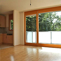 Im Grünen gelegene Wohnung bestehend aus einem Vorraum, einem großzügigem Wohnraum mit angrenzendem Balkon, einem Schlafzimmer, Küche, Bad (mit Badewanne) und WC.