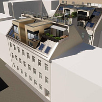 A la Bohème aber ganz modern: Wohnen im Dachgeschoss am Franziskanerplatz. Der Dachgeschoßausbau und die Renovierung des aus der Frühklassik stammenden Gebäudes erfolgte 2018.