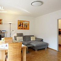 Der Wohnbereich ist lichtdurchflutet und mit Parkett…