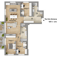 Vorraum1-2 Schlafzimmergroßzügiger Wohn-Ess-KüchenbereichBadWCAbstellraumVom Wohn-Essbereich, teilweise auch von den Schlafzimmern aus, gelangt man auf die großzügigen, sonnigen Terrassen bzw.…