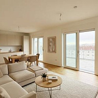 2-Zimmer-Wohnung mit 53 qm Wfl. im 15. Obergeschoss einer Wohnanlage mit Balkon; Baujahr 2020 - mit Vorraum, Bad/WC, Abstellraum, Wohnküche, Schlafzimmer und Balkon - Parkett im Wohnbereich,…