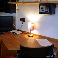 Modern möbliert mit Safe, Teekocher, Geschirr und Kochutensilien.