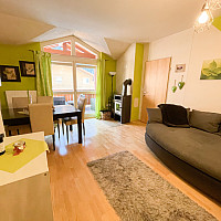 Galeriewohnung mit Kellerersatzraum und Autoabstellplatz am Stadtrand.