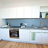 Das Serviced Apartment ist komplett eingerichtet und besteht aus einem Wohnzimmer mit Küche und Essplatz für zwei Personen, einem Schlafzimmer, einem Badezimmer mit bodengleicher Dusche und WC und…