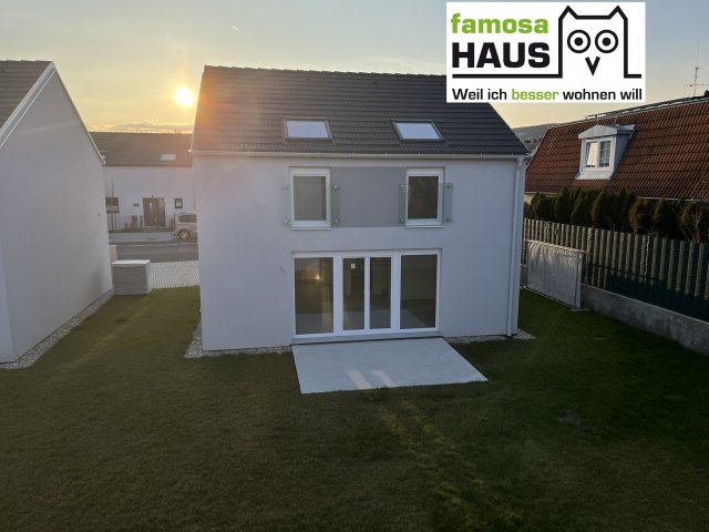 Famosahaus - Qualität und Erfahrung seit 26 Jahren. Belagsfertig - provisionsfrei! Dieses Famosahaus verfügt über ca. 109 m² Wohnfläche (EG und OG) und rund 167 m² Nutzfläche samt Keller. Sonnendurchflutetes Wohnzimmer, Küche, 3 zentral begehbare Schlafzimmer, Bad, 2 WC und Vollunterkellerung. (Raumhöhe im OG bis 3,30 Meter). Der Preis beinhaltet das ziegelmassive Niedrigenergiehaus komplett belagsfertig inklusive: .) Hauseingangstüre mit 3-fach Verriegelung und Fenster mit 3-fach Verglasung (Rekord) .) Luftwärmepumpe (Heiz- und Kühlfunktion) mit Fußbodenheizung im EG und OG (Vaillant) .) Sonnenkollektoren für die Warmwasseraufbereitung (Vaillant) .) wasserdichter, wärmegedämmter Vollunterkellerung mit 2 Kellerfenstern .) 12 m² Terrasse .) Errichtung des Gartens und der Außenanlagen .) Errichtung von 2 PKW-Abstellplätze .) Strom-, Wasser- und Kanalanschlussgebühren .) Aufschließungsabgabe .) TÜV-AUSTRIA Baubegleitung Wenn Sie die Wohnbauförderung vom Land NÖ in Anspruch nehmen, erhalten Sie ein 1% verzinstes Darlehen. Nähere Infos über die Höhe der Förderung und die Voraussetzungen erhalten Sie auf Anfrage. Die Betriebskosten betragen nur ca. € 150,-- / Monat. Profitieren Sie von der Mitplanungsmöglichkeit und 3 Jahren Gewährleistung ab Schlüsselübergabe. Informieren Sie sich einfach unverbindlich. Senden Sie uns Ihre Anfrage - wir freuen uns darauf, Sie beraten zu dürfen.
