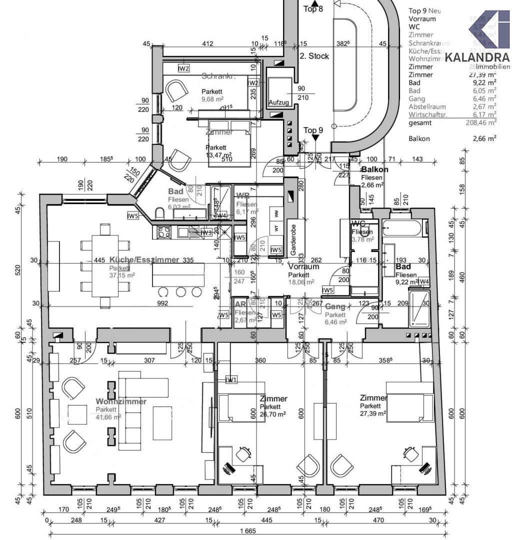 geräumiger Vorraum (ca. 18m²), Gäste-WC (ca. 4m²), großes Wohnzimmer (ca. 42m²), Eßzimmer mit offen gestalteter Wohnküche (ca. 37m²), drei weitere Schlaf-/ Zimmer (ca. 23m², 27m² & 28m²), Badezimmer mit Wanne, Dusche & WC (ca. 9m²), ein Duschbad mit WC (ca. 6m²), Wirtschaftsraum mit Anschlüssen für Waschmaschine & Trockner (ca. 6m²), Garderobe/ Abstellraum (ca. 3m²), vom Vorraum ist ein ca. 3m² großer, hofseitiger Balkon zugänglich.