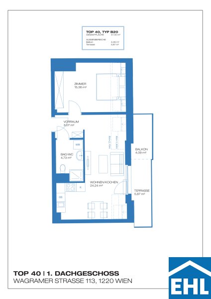 Top 40 befindet sich im 1. Dachgeschoss, hat 2 Zimmer und einen geräumigen Balkon. Zur schlüsselfertigen Wohnung erhalten sie ein Markenküche!
