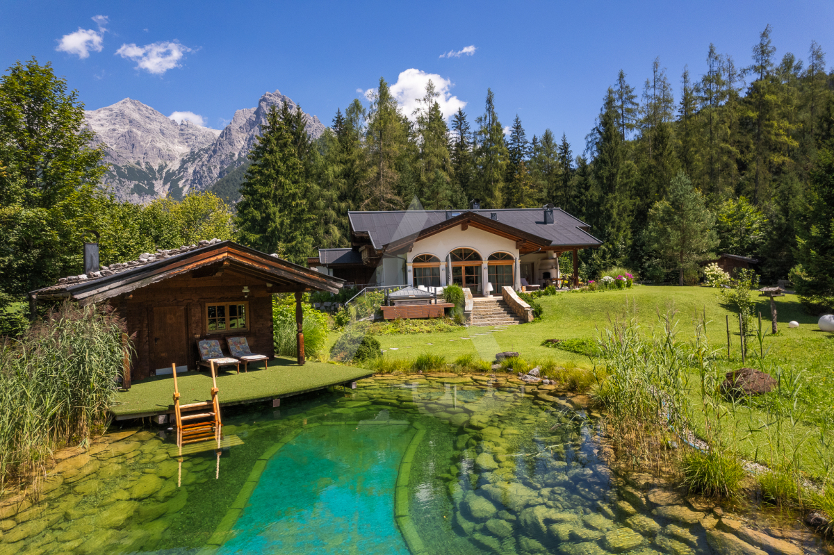 In absoluter Naturlage umgeben von Wiesen und Wäldern befindet sich diese Liegenschaft auf einem ca. 3.620 m² großen Grundstück. Der Blick reicht von der Buchensteinwand über den Hochgründberg bis zum Massiv der Loferer Steinberge.