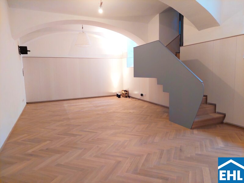 Von der Schelleingasse aus gelangt man über eine Treppe in das etwa 43 m² große Geschäftslokal im Souterrain. Die Wände dieses Raumes wurden mit einer weiß lasierten, mannshohen Holzverschalung verkleidet. Der Zwischenraum zum Mauerwerk ist mit einer maschinell betriebenen Hinterlüftung versehen. Durch einen Gang ist dieser Geschäftsraum mit den Nebenräumen – Badezimmer und WC – und einem weiteren ca. 20 m² großen Zimmer verbunden. Von diesem sowie vom Stiegenhaus aus gelangt man in den Innenhof des Hauses. In beiden Zimmern befinden sich bereits Küchenanschlüsse.