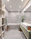 - Echtholzparkett in Wohnräumen, edles Feinsteinzeug in Nassbereichen
