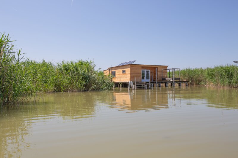 Diese von einem dichten Schilfgürtel abgeschirmte, südöstlich ausgerichtete Flachdach-Seehütte befindet sich auf einem ca. 150 m² großen Plateau. Sie wurde laufend instand gehalten und mit viel Liebe gepflegt. Die Liegenschaft bietet einen traumhaften Blick auf den offenen See und befindet sich in ruhiger Lage, abseits der stärker frequentierten Bereiche der Ruster Bucht. Die Hütte ist mit dem E-Boot vom Ruster Hafen aus in etwa 15–20 Minuten (je nach Motorisierung) erreichbar.