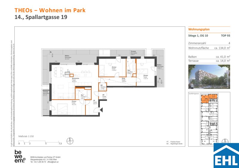Wohnen über den Dächern – mit Weitblick und StilIn der 10. Etage von Stiege 1 befindet sich die exklusive 4-Zimmer-Eigentumswohnung TOP 93 mit ca. 134 m² Wohnnutzfläche, einem umlaufenden Balkon von ca. 41 m² sowie einer zusätzlichen Terrasse mit ca. 14 m². Ein echtes Highlight ist der spektakuläre Weitblick – von der Otto-Wagner-Kirche bis zur Inneren Stadt Wiens. Diese Wohnung kombiniert Großzügigkeit, Ruhe und Panorama in einer Form, die in Wien ihresgleichen sucht.