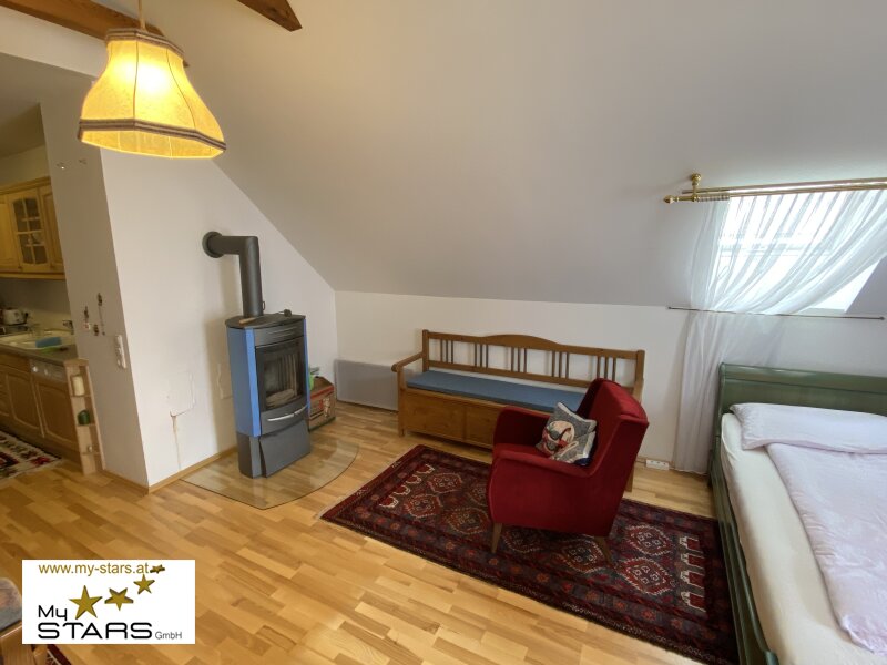Der offen gestaltete Wohn- und Schlafbereich besticht durch hohe Räume, freigelegte Dachbalken und warme Holzoberflächen. Die stilvolle Einbauküche fügt sich dezent in das Raumkonzept ein. Ein modernes Badezimmer mit Dusche rundet das Angebot ab.