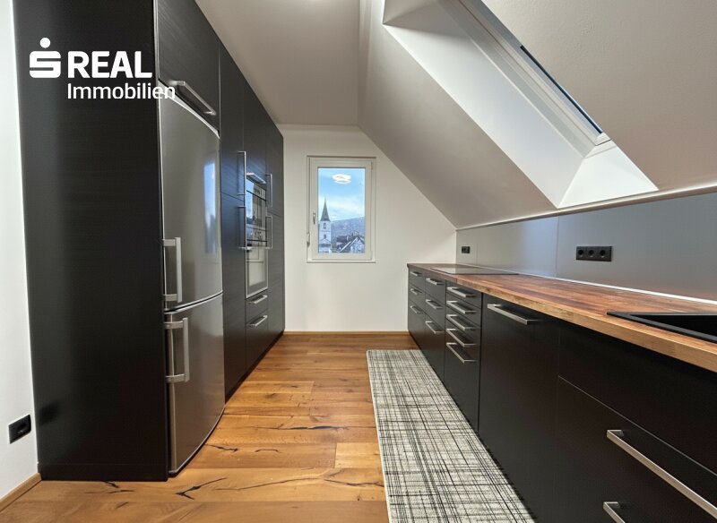 Der Vorraum im unteren Stockwerk führt über eine Treppe in den großzügigen Wohnbereich, der durch ein Dachfenster besonders hell und einladend wirkt. Der offene Wohnbereich geht nahtlos in die geräumige, moderne Küche über, die perfekt für gesellige Kochabende geeignet ist. Vom Wohnzimmer aus gelangen Sie auf den überdachten Balkon, von dem aus Sie einen schönen Blick ins Grüne genießen können – ideal für entspannte Stunden im Freien.