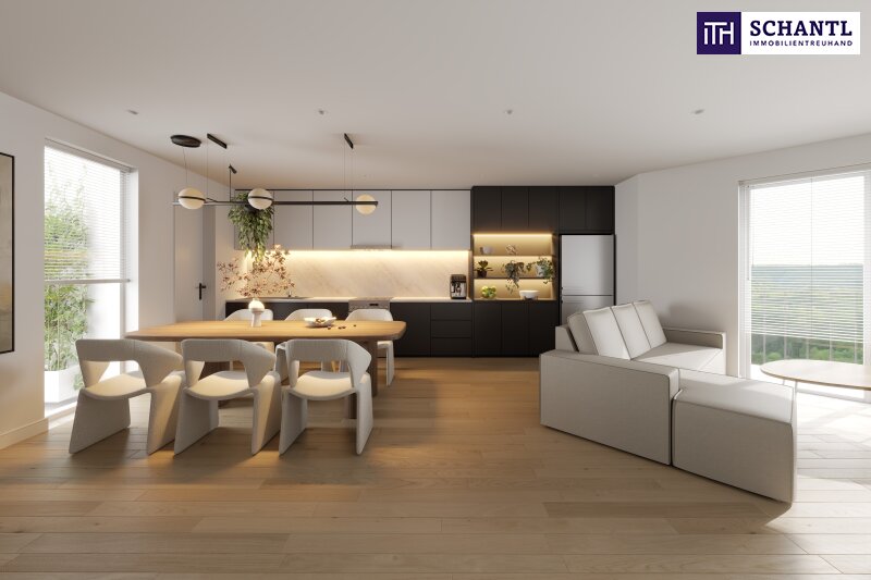 Die Wohnküche bildet das Herzstück der Wohnung – großzügig, hell und mit direktem Zugang zum privaten Garten. Dieser lädt zum Entspannen, Gärtnern oder gemütlichen Beisammensein ein. Die Loggia an der Nordwestseite sorgt zudem für einen weiteren geschützten Außenbereich.