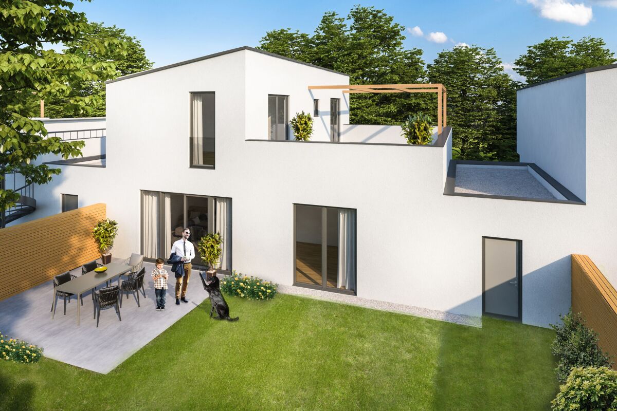 Jedes Haus bietet eine Terrasse im OG mit ca. 53 m², zwei Autoabstellplätze und einen eigenen Garten. Der Garten stellt ein eher privates Refugium dar und ist von außen kaum einsehbar.