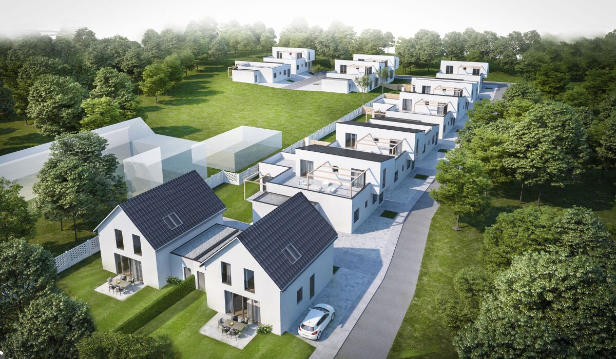 Mitten im Ortszentrum und doch in einer wenig befahrenen Nebenstraße werden 13 Einfamilienhäuser errichtet, die sich wiederum in einer noch weniger befahrenen Sackgasse aneinanderreihen.