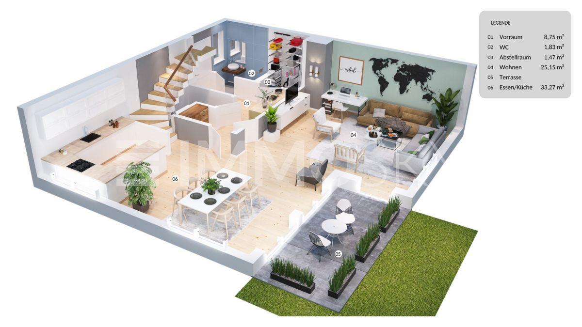 Wohnebene Erdgeschoß: einladendes Entrée, offene Wohnküche inkl. Gartenzugang, Abstellraum und Toilette