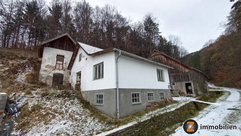 Haus 2: Sehr stark sanierungsbedürftiges Haus, dahinter ein großer Stadl für verschiedene Zwecke. Der Preis beinhaltet beide Objekte mit einer Gesamtfläche von ca. 2.000 m². Die 2 Objekte könnten eventuell auch getrennt verkauft werden.