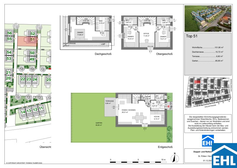 Die Häuser verfügen über drei Etagen, wobei in den meisten Einheiten ein zusätzliches Kellergeschoß ausgeführt wird. Die Wohnflächen variieren zwischen 99 und 109 m² und bieten mit 4 Zimmern ausreichend Platz und Komfort für eine Familie. Großzügige Freiflächen in Form von Gärten, Terrassen und Dachterrassen laden zum Entspannen und Genießen ein. Hier können Sie Ihren grünen Daumen entfalten und entspannte, gesellige Stunden mit Freunden und Familie erleben. Für jede Wohneinheit sind zudem 2 Tiefgaragenplätze vorgesehen, die bequem erreichbar und schon im Kaufpreis inbegriffen sind.