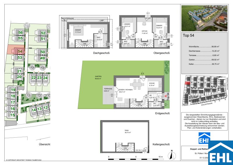 Die Häuser verfügen über drei Etagen, wobei in den meisten Einheiten ein zusätzliches Kellergeschoß ausgeführt wird. Die Wohnflächen variieren zwischen 99 und 109 m² und bieten mit 4 Zimmern ausreichend Platz und Komfort für eine Familie. Großzügige Freiflächen in Form von Gärten, Terrassen und Dachterrassen laden zum Entspannen und Genießen ein. Hier können Sie Ihren grünen Daumen entfalten und entspannte, gesellige Stunden mit Freunden und Familie erleben. Für jede Wohneinheit sind zudem 2 Tiefgaragenplätze vorgesehen, die bequem erreichbar und schon im Kaufpreis inbegriffen sind.
