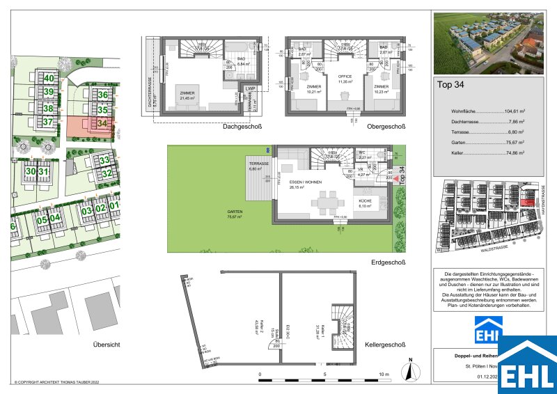 Die Häuser verfügen über drei Etagen, wobei in den meisten Einheiten ein zusätzliches Kellergeschoß ausgeführt wird. Die Wohnflächen variieren zwischen 99 und 109 m² und bieten mit 4 Zimmern ausreichend Platz und Komfort für eine Familie. Großzügige Freiflächen in Form von Gärten, Terrassen und Dachterrassen laden zum Entspannen und Genießen ein. Hier können Sie Ihren grünen Daumen entfalten und entspannte, gesellige Stunden mit Freunden und Familie erleben. Für jede Wohneinheit sind zudem 2 Tiefgaragenplätze vorgesehen, die bequem erreichbar und schon im Kaufpreis inbegriffen sind.