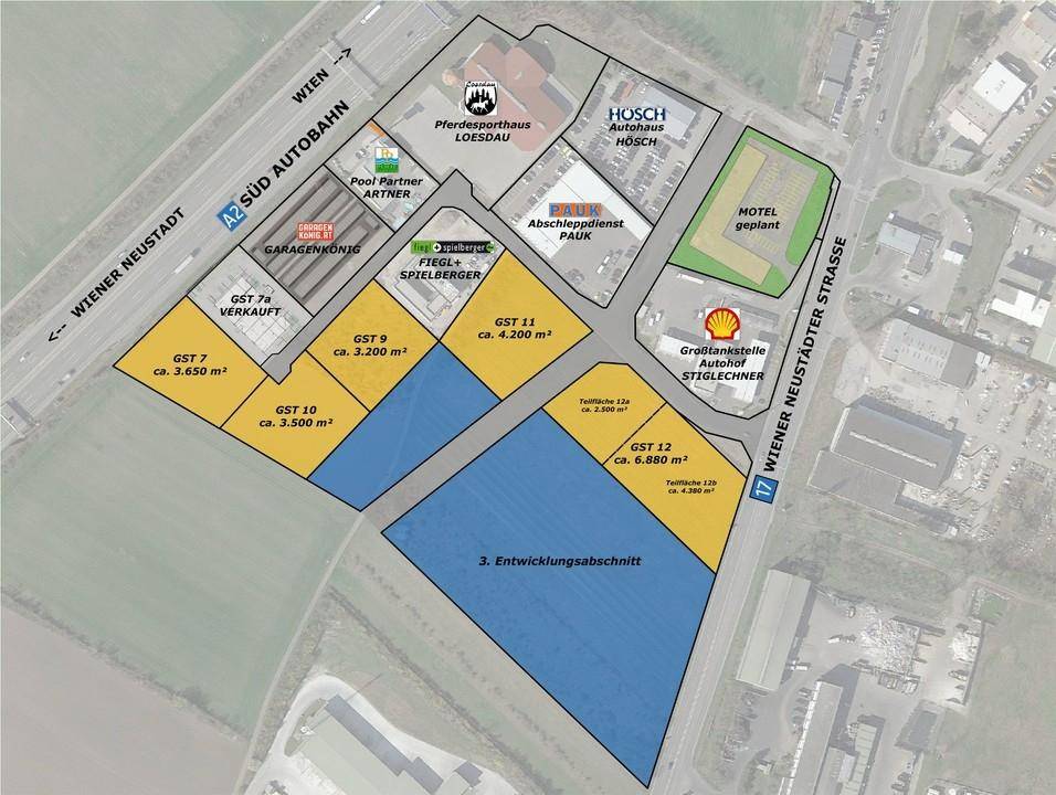 Der Servicepark wird im Auftrag der Liegenschaftseigentümerin, der A2-AutohofbetriebsgesmbH, entwickelt und in drei Abschnitten realisiert. Die Zufahrt zum Projektareal erfolgt von der B17 über eine ampelgeregelte Kreuzung und die jeweiligen Bauparzellen sind voll aufgeschlossen (Anschlüsse Wasser, Kanal, Strom, Telekommunikation an der Grundstücksgrenze). Die Parzellen im 1. Entwicklungsabschnitt sind zur Gänze verwertet: • Pferdesporthaus Loesdau • Autohaus Hösch • Pool Partner Artner • Abschleppdienst PAUK • SHELL Großtankstelle / Firma Stiglechner • Motel 180 Betten / Firma Parkinvest (geplant) Daten und Fakten 2. und 3. Entwicklungsabschnitt • Parzellengrößen ab 2.500 m² • Anschlüsse: Wasser, Kanal, Strom, Telekommunikation • aktuelle Widmung: Bauland-Betriebsgebiet • Kaufpreise ab EUR 160,00 netto pro m², je nach Lage und Grundstücksgröße • zuzüglich Aufschließungsabgabe und Anschlusskosten Hinsichtlich möglicher Grundstücksgrößen wurde ein Parzellierungsentwurf erstellt, welcher auf individuelle Kundenbedürfnisse ange-passt werden kann.
