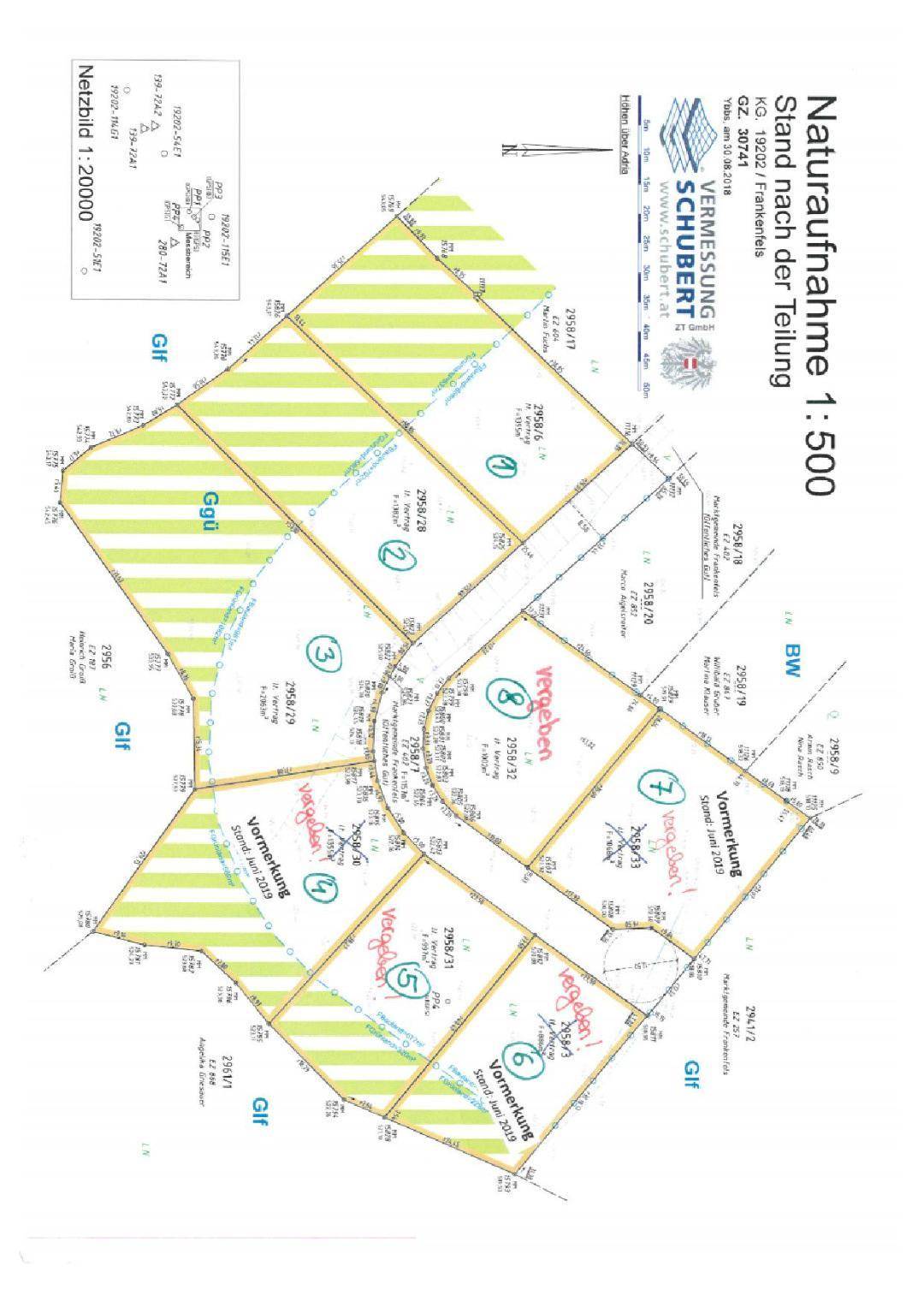 8 neue Baugründe werden im Fischbachgraben aufgeschlossen. Die Größe der Parzellen beträgt von 1445 m² bis 921 m². Preis: Bauland á 35 m² - Grünland á 15 m² Vormerkungen: Schriftlich (Gemeindeamt 3213 Frankenfels, Markt 10) oder per E-Mail isabella.wutzl@frankenfels.at Sie erhalten dann eine E-Mail retour, dass Sie für Parzelle Nr. …… vorgemerkt sind. Kaufvertrag: Die notarielle Kaufvertragsunterfertigung ist für Sommer/Herbst 2018 geplant.