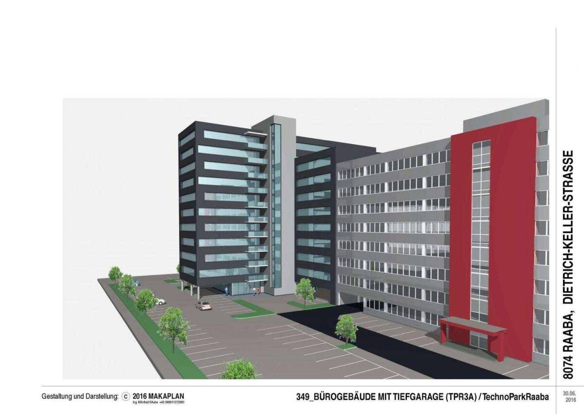 NEUBAU BÜROFLÄCHEN TECHNOPARK RAABA Der Technopark Raaba bietet durch die Bestlage am südlichen Grazer Stradtrand, sowie die hervorragende Infrastruktur und modernste Bürogebäude den besten Wirtschaftsstandort der Steiermark. Heute schätzen dies bereits über 1.300 Mitarbeiter in rund 40.000 m² zugfrei klimatisierten Büro- und Geschäftsflächen. Diese Neubauprojekt wird mit Ende des Jahres 2017 beginnen und umfasst ca. 7.500 m² Büroflächen und 80 Tiefgaragenabstellplätze. Ab dem 1. Obergeschoss sind die Büroräumlichkeiten in 3 Größen aufgeteilt: 200 m² 250 m² 330 m² Auch ist es möglich Büroeinheiten zu verbinden um eine größere Fläche zu erlangen. Sämtliche Büroflächen werden mit einer zugfreien Heiz- und Kühldecke ausgestattet. Bezug ab Herbst/Winter 2018 möglich. Parkplätze werden in der Tiefgarage, auf asphaltierten sowie auf geschotterten Flächen errichtet. Der Technopark Raaba besticht durch beste Erreichbarkeit, ein modernes Erscheinungsbild, flächenökonomische Bürokonzepte, flexible Nutzungsmöglichkeiten, hohe ökologische Standards, folglich resultierende Betriebskostensparsamkeit sowie ein erhöhtes Augenmerk in Bezug auf das Thema Sicherheit. Beste Infrastruktur bilden wir mit dem Nahversorger Billa, Raucherzonen in allen Stockwerken, Konferenz-räumlichkeiten, einem Restaurant für 1.000 Mittagsgäste, einer Business Lounge sowie einem Reisebüro. Auch wird das Thema Gesundheit im Technopark Raaba sehr groß geschrieben daher verfügen wir über zwei Fitnesseinrichtungen und einem Kinderärztezentrum. Sämtliche Büro- und Geschäftsflächen wurden bzw. werden mittels zugfreier Heiz- und Kühldecken ausgestattet. Ein weiteres Plus sind die zahlreichen Parkplätze für Mitarbeiter und Kunden.