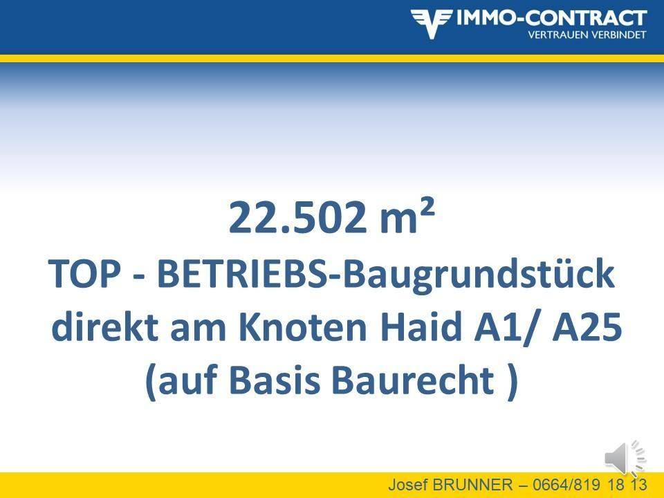 22.502 m² TOP - BETRIEBS-Baugrundstück direkt am Knoten Haid A1/ A25 (auf Basis Baurecht) Die Liegenschaft (Widmung B + MB) liegt im Gemeindegebiet Ansfelden in unmittelbarer Nähe zur Hauptverkehrsachse Autobahn A1/A25 bzw. B139 Die Gesamtgröße der gegenständlichen Liegenschaft beträgt ca. 22.500 m² und kann auf Basis Baurecht angemietet werden. Zu- und Abfahrt in beide Richtungen über die bestehenden Anbindungen B139 sowie A1 Westautobahn möglich. Die A1 Westautobahn (Anschlussstelle Traun) ist nur 1min entfernt. Uneingeschränkte Sichtbarkeit sowie HÖCHSTE FREQUENZ (100.000 KFZ/ Tag) verkehrsgünstige TOPLAGE mit HÖCHSTER AUSSENWIRKUNG In UNMITTELBARER UMGEBUNG haben sich zahlreiche Unternehmen und Handelsbetriebe angesiedelt, unter anderem HAGLEITNER Hygiene, IKEA sowie das HAIDCENTER, mit vielen namhaften Handelsbetrieben. Aufgrund der hochfrequentierten Lage, der Größe der Liegenschaft, sowie Sichtbarkeit von der A1/A25, der günstigen Verkehrsanbindung und der Nähe zur Landeshauptstadt Linz eignet sich diese Betriebsliegenschaft u.a. sehr gut als Handels-, Lager-, Produktions- oder Logistikstandort. VIP-Service Unsere brandaktuellsten Angebote finden sie zuerst auf unserer Homepage! www.IMMO-CONTRACT.com Immer einen Besuch wert. Rufen Sie mich an, ich stehe Ihnen für weitere Informationen, Besichtigungen und Finanzierungsfragen gerne zur Verfügung Josef Brunner, Tel. 0664/8191813 Rund 3.000 aktuelle Immobilien: www.IMMO-CONTRACT.com wir danken für Ihre Empfehlung. Ich - Josef BRUNNER - bin laufend auf der Suche nach Grundstücke, Eigentumswohnungen und Häuser für vorgemerkte Kunden. Ich bin für Sie erreichbar unter 0664/819 18 13 oder josef.brunner@immo-contract.com Angaben gemäß gesetzlichem Erfordernis: Miete € 31502,8 zzgl 20% USt. Umsatzsteuer € 6300,56 ------------------------------------------------------------------ Gesamtbetrag € 37803,36