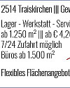 Moderne Büro und Lagerflächen - Nähe A2 Büro: ab 147 m² - 911 m² - ab € 9,50/m² (je nach Lage und Ausstattung) Betriebskosten: € 1,50/m² - € 2,90/m² netto inkl. Heizung Lager: ab 286 - 1.972 m² - ab € 6,40/m² (je nach Lage und Ausstattung) Kleinlager: ab 22 m² - variablen Büro- und Lagergrößen - Großzügige Verkehrswege und Freiflächen - Ausreichend Gratis-Parkplätze - Beste Verkehrsanbindung – direkter Autobahnanschluss - fachmännischen Betreuung bei Planung, Einbauten, technischen Installationen, Übersiedlung und Logistik-Know-how. Der Zugang in die jeweils ebenerdig gelegenen Lagerbereiche sowie die zwei darüber liegenden Büroetagen erfolgt über mehrere Stiegenaufgänge. Das Gebäude wurde in Stahlbeton-Skelettbauweise mit einer vorgehängten Fassade errichtet. Die Büro- und Lagereinheiten sind in Brandabschnitte unterteilt. Sämtliche Mietflächen und Stiegenhäuser sind an eine zentrale Brandmeldeanlage mit direkter TUS-Anbindung zur örtlichen Feuerwehr angeschlossen. BÜRO: Konstruktiver Aufbau – Büroraum: -Die innenliegenden Trennwände sind als Gipskarton-Metallständerwände in erforderlicher Brand-Widerstandsklasse oder in Massivbauweise ausgeführt. -Im Bürobereich Textilbelag, in den Nassräumen keramischer Belag. -Die max. Bodenbelastung in den Büros beträgt 500 kg/m². -Kunststofffenster mit Aludeckschale außen und Isolierverglasung, mittels Dreh-/Kippbeschlag zu öffnenden Fensterflügeln, einschließlich außen montierten Sonnenschutz-Jalousien -Alle Sanitärräume mit mechanischer Be- und Entlüftung -Die Büroflächen werden mittels Gaszentralheizung (externes Heizhaus) und Radiatoren, die Parapetbereich untergebracht sind, beheizt. -Sichtschienendecke mit Mineralfaserelementen, 62,5/62,5 cm Rastermaß mit eingebauten Rasterleuchten -Pro Büroeinheit ist als Minimum ein Herren- und Damen WC mit angeschlossener Garderobe sowie ein eigener Raum mit einer Kompaktküche vorhanden. -Massives Parapet mit vorgehängter Waschbetonfassade. -Decke über EG, 1. + 2. OG als Stahlbeton-Elementdecke -Wärmegedämmtes, 2-lagiges Bitumendach Kiesauflage und Innenentwässerung (Warmdach) LAGER: Multifunktionelle Lagerflächen mit optimal dimensionierter Belichtung und Sicht ins Freie: - Lagertiefen zwischen 35 – 42 m - Lagerhöhe zwischen 6 – 8,5 m - großzügige angelegte Verkehrswege und Andockflächen - alle Lagereinheiten sind mit Überland-LKW direkt erreichbar - beheizt oder unbeheizt Lagerräume: -Wärmegedämmte Trapezblech-Kassettenwände -Die innenliegenden Trennwände sind als Gipskarton-Metallständerwände in erforderlicher Brand-Widerstandsklasse oder in Massivbauweise ausgeführt. -Monolithischer geschliffener Betonboden mit einer Tragkraft bis zu 5.000 kg/m² -Luftheizgeräten, die an die im allgemeinen Teil erwähnte Anlage angeschlossen werden können, ist technisch vorbereitet -Die natürliche Belichtung der Hallen erfolgt mittels Lichtkuppeln, Kunststofffenster mit Aludeckschale außen und Isolierverglasung bzw. Sichtelementen in den Toren -Sektionaltore aus Alu -Im Lagerbereich ist 173 der Lichtkuppeln mechanisch lüftbar (E-Antrieb) und als Brandrauchklappen (Anschluss an die Brandmeldeanlage) ausgeführt. -Wärmegedämmtes, 2-lagiges Bitumendach auf Trapezblech-Dachkonstruktion mit Innenentwässerung Hochregallager: Das moderne Hochregallager bietet Ihnen auf 7 Regalebenen eine optimale Nutzung der Lagerfläche. Die 3 m breiten Regalgänge ermöglichen eine maximale Bewegungsfreiheit für die Hochregal-Stapler. Die zusätzliche, 4 m breite, überdachte Verladerampe verfügt über 3 elektrische Anpassrampen, um Niveauunterschiede zentimetergenau ausgleichen zu können. Großzügige Andockflächen und Verkehrswege ermöglichen einen flüssigen Verkehrsablauf, ohne jede Einschränkung! Ihre Vorteile: - Lagermanagement - Erstellung professioneller Lagerkonzepte - Hydraulische Verladebrücken - Individuelle Warenbehandlung - Nationale und europaweite Auslieferungen - Überdachte 4m breite Rampe ------------ Energieausweis: Objekt 58A Energieklasse: C spez. HWB: 83 kWh/m²a Objekt 58B Energieklasse: C spez. HWB: 66 kWh/m²a Objekt 58C Energieklasse: C spez. HWB: 73 kWh/m²a Objekt 58D Energieklasse: B/C spez. HWB: 48kWh/m²a Objekt 69 Energieklasse: B spez. HWB: 40 kWh/m²a Objekt 70 Energieklasse: B/C spez. HWB: 43 kWh/m²a Objekt 77 Energieklasse: A spez. HWB: 24,8 kWh/m²a Kaution: 3BMM Provision: 3BMM Jetzt besichtigen! Kontakt DPC Immobilien GmbH Tel: 01/904 94 50 office@dpcimmobilien.at www.dpcimmobilien.at ---------------------- Nicht das richtige Objekt für Sie? Besuchen Sie direkt unsere Website www.dpcimmobilien.at und finden über 100 weitere Gewerbeflächen. Wir freuen uns auf Ihre Anfrage! --------------------- Alle Angaben verstehen sich zzgl. der gesetzlichen MWSt.