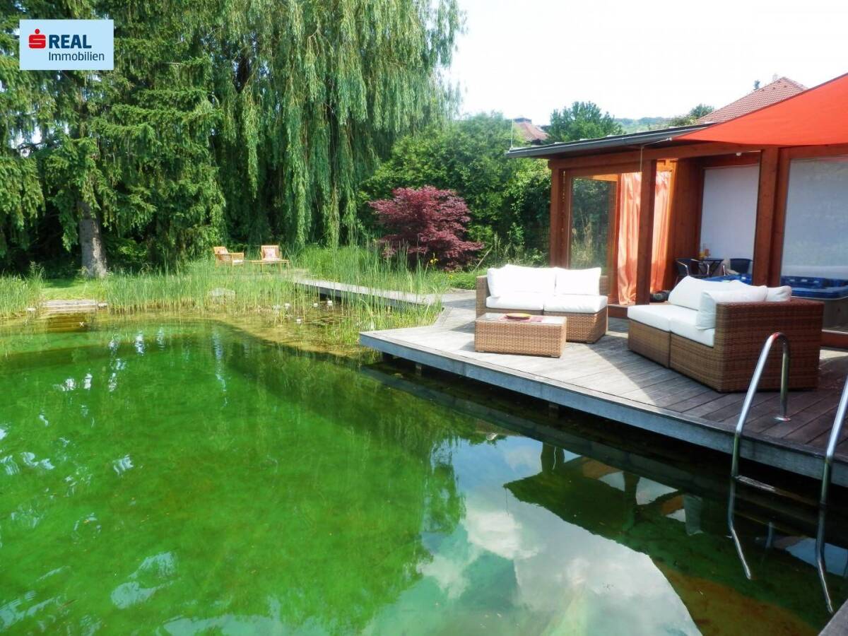 Mit Objekten, die mir persönlich gut gefallen und noch dazu eine Traumlage haben, arbeite ich besonders gerne und dieses Haus gehört hier eindeutig dazu.Das Wohnhaus Baujahr 1970 wurde 2009 erworben und um- u. zugebaut. Das jetzt moderne und neuwertige Haus liegt in einer ruhigen Siedlung mit Fahnenparzelle.Der Bungalow ist teilunterkellert (Heizraum), im Erdgeschoß befinden sich der offene Wohnbereich mit großer Küche, Wohn- u. Essbereich, 3 Schlafzimmern, 2 Bädern, 2 WCs, Sauna mit Infrarot und Sternenhimmel, Wintergarten, sehr große Terrasse, Schwimmteich, Garage mit Carport. Der schöne angelegte Garten mit seinen Bäumen und Rosen-Sträuchern kombiniert mit dem Schwimmteich und Terrassen idyllisch und ein kleines Paradies auf Erden.Diese traumhaft schöne Liegenschaft besticht durch die große Terrasse, Saune kombiniert mit Infrarot und Sternenhimmel, Wintergarten, Whirlpool, Rasenroboter und den großen Schwimmteich mit ca. 190 m² - und alles baubehördlich genehmigt.Hier können Sie auf Erden das Paradies genießen, abschalten vom Stress und die pure Natur mit eigenem Schwimmteich und großer Terrasse mit Wintergarten und Whirlpool genießen.Warten Sie nicht zu lange mit einem Besichtigungstermin, denn dieses sonnige Naturparadies wird schon bald vergriffen sein.Auskunft unter Andreas Gundacker M +43 664 8385831 oder E-Mail: andreas.gundacker@sreal.atInfrastruktur / EntfernungenGesundheit Arzt <5.500m Apotheke <6.500m Krankenhaus <6.500m Kinder & Schulen Kindergarten <4.500m Schule <1.000m Universität <6.000m Höhere Schule <6.500m Nahversorgung Supermarkt <2.000m Bäckerei <5.500m Einkaufszentrum <7.500m Sonstige Bank <6.000m Geldautomat <4.000m Post <1.000m Polizei <2.500m Verkehr Bus <1.000m Bahnhof <5.000m Autobahnanschluss <9.500m Angaben Entfernung Luftlinie / Quelle: OpenStreetMap