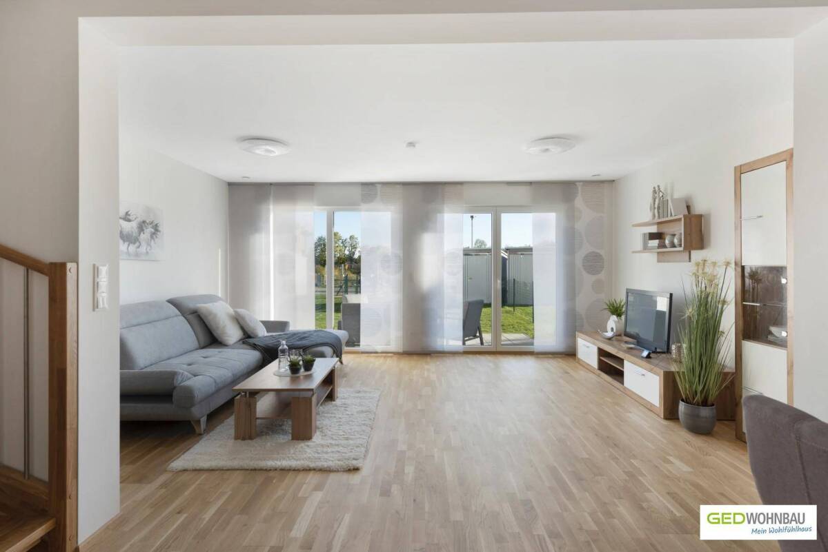 Das Erdgeschoss besteht aus einem lichtdurchfluteten offenen Wohn-, Koch- und Essbereich mit Zugang auf die Terrasse und in den Garten. Auf dieser Ebene befinden sich das Vorzimmer, ein Gäste-WC, der Technikraum und ein zusätzlicher Abstellraum, der auch gut als Büro genutzt werden kann. Im Obergeschoss befinden sich drei getrennt begehbare Schlafzimmer mit einer Galerie (Option für Schrankraum), sowie ein großzügiges Badezimmer mit Fenster. Die Terrasse und der südseitig ausgerichtete Garten laden zum Entspannen und Seele baumeln lassen ein.Ihr schlüsselfertiges GED-Wohlfühlhaus umfasst folgende Ausführungen & Services: Innentüren Sanitärausstattung (Waschbecken, Armaturen, Badewanne, Dusche, WCs) Parkett- sowie Laminatböden und Fliesen Feinspachtelung der Wand- & Deckenflächen (Innenwände) inklusive AnstrichFassade Bauendreinigung Hochwertige Ausstattung Exklusive Parkett- und Laminatböden in allen Wohn- u. SchlafräumenVollholzstiege aus Niederösterreich Moderne Badezimmer mit 2 Waschbecken, Badewanne, Dusche und WCGäste-WC im ErdgeschoßFußbodenheizung im ErdgeschoßWohnraumbelüftungsanlage nach dem neuesten Stand der TechnikEingezäunter Garten2 PKW AbstellplätzeIhre GED-Vorteile auf einen Blick Provisionsfrei, direkt vom Bauträger (bei Miete und Kauf) Niedrigste Energiekosten durch Passivbauweise (ca. € 300,-/ Jahr) Schlüsselfertig – einziehen & wohlfühlen [betr. Kauf, bei Miete nicht zutreffend:] Kaufpreis abzüglich höchster Landesförderung: min. € 40.000,- Passivhausförderung des Landes NÖ + eventuelle Familienförderung Erste Zahlung erst bei SchlüsselübergabeAngenehmes Wohnklima durch Holzmassivbauweise und lichtdurchflutete RäumeVerwendung nachhaltiger & nachwachsender Rohstoffe Verwirklichen Sie Ihren Traum vom Haus mit Garten! Wir unterstützen Sie gerne in allen Fragen zur Finanzierung & Förderung! GED-Wohlfühlhäuser werden schlüsselfertig errichtet – provisionsfrei direkt vom Bauträger.Alle GED Wohlfühlhäuser sind klimaaktiv Gold zertifiziert und werden in Passivbauweise aus hochwertigen, ökologischen Materialien errichtet. Das Passivhaus ist ein gut durchdachtes Energiewunder, das darauf abzielt, durch optimale Wärmedämmung und intelligente Belüftungssysteme passive Energiequellen wie die Sonne und sogar die Körpertemperatur seiner Bewohner zu nutzen.Die massive Bauweise in Kreuzlagenvollholzelementen samt Wärmedämmung (Energiekennzahl unter 10 kWh/(m²a)) und das zentrale Lüftungsgerät mit einer Luft-Wasser-Wärmepumpe im Außenbereich helfen mit, ein optimales Wohnklima zu schaffen und die Heizkosten so niedrig wie möglich zu halten.Infrastruktur / EntfernungenGesundheit Arzt <1.975m Apotheke <625m Krankenhaus <3.550m Kinder & Schulen Schule <675m Kindergarten <1.200m Nahversorgung Supermarkt <425m Bäckerei <525m Einkaufszentrum <2.200m Sonstige Bank <500m Geldautomat <500m Post <500m Polizei <2.050m Verkehr Bus <75m Bahnhof <1.000m Autobahnanschluss <3.675m Angaben Entfernung Luftlinie / Quelle: OpenStreetMap
