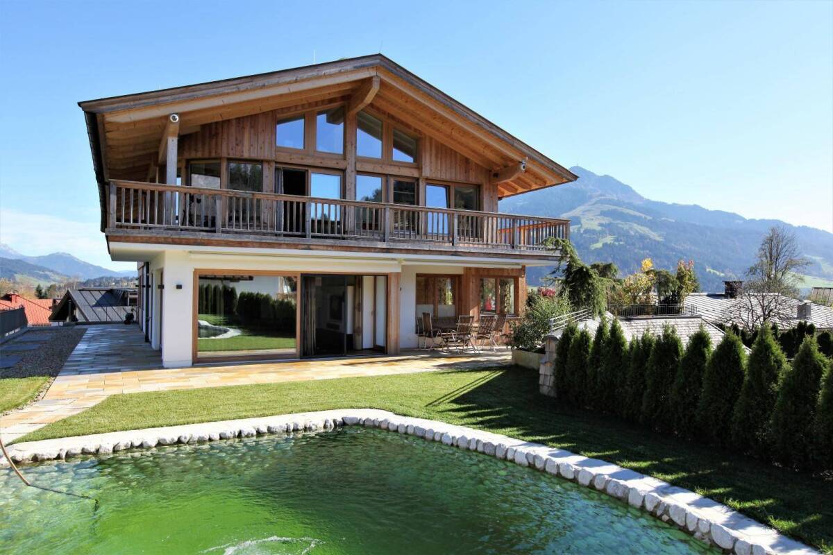 Gleich beim ersten Besuch dieses Anwesens ist man überwältigt vom herrlichen, unverbaubaren 360° Ausblick auf die umliegende Bergwelt. Von der großen südseitigen Sonnenterrasse, dem aufwändig errichteten Naturbiotop-Garten wie auch den verschiedenen Balkonen genießt man das Kitzbüheler Horn, den Wilden Kaiser, die Loferer Steinberge sowie das Kitzbüheler Schigebiet.Das neu errichtete Landhaus mit separatem Gästehaus liegt in einer ruhigen Villengegend, von hier gelangt man auch zu den zahlreichen Wanderwegen und zur Langlaufloipe im Winter. Die Wohnnutzfläche gesamt beträgt ca. 565 m².Die hochwertig ausgestattete Immobilie erstreckt sich über 3 Ebenen, die mit einem Hauslift verbunden sind. Die Inneneinrichtung bietet einen gelungenen Mix aus traditioneller Tiroler Gemütlichkeit und modernen Wohnaccessoires. Die moderne Küche mit Frühstücksbar und Esszimmer grenzt an eine original Zirbenstube mit Bauernofen und Ottoman. Der Wohnraum mit offenem Kamin gibt durch große Glasflächen den Blick auf den Wilden Kaiser frei. Besonderer Wert wurde auf das Wohlgefühl in den Schlafräumen durch den Einbau von Zirbenholzmöbel gelegt. Zusätzlich wurde der Masterbedroom im Dachgeschoß als „Panic-Raum“ gesichert. Nach anstrengenden Bergwanderungen oder sportlichen Schitagen bietet der Wellnessbereich mit Pool samt Gegenstromanlage, Whirlpool, Sauna, Gym und einer beleuchteten Salzsteinwand den idealen Ort zur Entspannung.Das getrennte Gästehaus verfügt über zwei Schlafräume mit Bad, Gästetoilette und einen Wohnraum mit integrierter Küche. Weiters bietet dieses geräumige Anwesen noch einen Bürotrakt mit Archiv und Technikraum, der auch als Kinderspielbereich, Kino oder weitere Schlafräume genutzt werden könnte.Die Haustechnik lässt keine Wünsche offen: BUS System, Videoüberwachung mit Alarmanlage, Hauslift etc. Das Grundstück besitzt einen eigenen Brunnen mit amtlich bescheinigter Trinkwasserqualität, 4 Garagenplätze sowie weitere Stellplätze im Freien. Die gesamte Immobilie ist als Freizeitwohnsitz gewidmet!Zusammengefasst eine hochinteressante Immobilie mit viel Platz für Familie, Freunde und Personal oder eine Kombination aus Wohnen und Arbeiten.Hinweis gemäß Energieausweisvorlagegesetz: Ein Energieausweis wurde vom Eigentümer bzw. Verkäufer, nach unserer Aufklärung über die ab 1.12.2012 geltende generelle Vorlagepflicht, sowie Aufforderung zu seiner Erstellung noch nicht vorgelegt. Daher gilt zumindest eine dem Alter und der Art des Gebäudes entsprechende Gesamtenergieeffizienz als vereinbart. Wir übernehmen keinerlei Gewähr oder Haftung für die tatsächliche Energieeffizienz der angebotenen Immobilie.Infrastruktur / EntfernungenGesundheit Arzt <2.000m Apotheke <1.500m Krankenhaus <2.500m Kinder & Schulen Schule <1.000m Kindergarten <2.000m Nahversorgung Supermarkt <1.500m Bäckerei <2.000m Sonstige Bank <2.000m Geldautomat <2.500m Post <2.000m Polizei <2.000m Verkehr Bus <500m Bahnhof <3.000m Flughafen <4.000m Angaben Entfernung Luftlinie / Quelle: OpenStreetMap