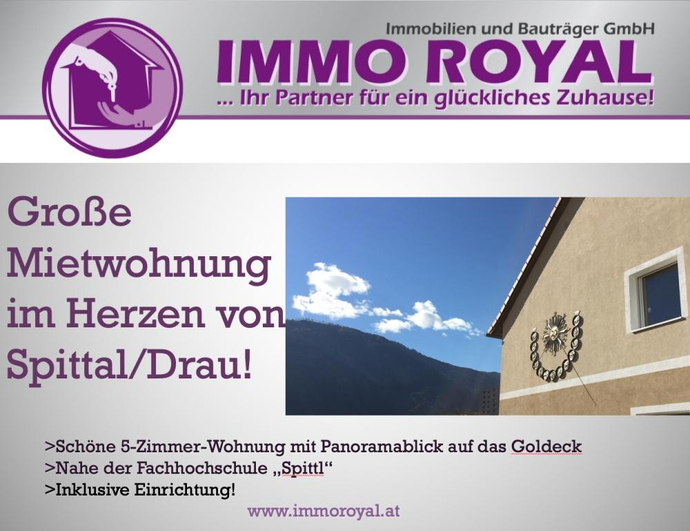 Diese Wohnung befindet sich im Stadtzentrum von Spittal/Drau diirekt gegenüber der Fachhochschule Spittl. Die Wohnung eignet sich bestens als Studentenwohnung, sowie für Familien mit mehreren Kindern. Raumaufteilung: 4 SZ, Küche/Esszimmer/Wohnzimmer, Bad/DU/WC, 2. WC, Abstellraum. Im Jahre 2015 wurde die gesamte Wohnanlage sowohl im Innen- als auch im Außenbereich komplett saniert - VWS, 3-fach verglaste Isolierfenster aus Kunststoff, Erneuerung der gesamten Wasser-Heiz- und Elektroinstallationen; neue Innentüren sowie feuerfeste Sicherheitseingangstür) Die Wohnung wird möbliert vermietet: zur Einbauküche zählen natürlich auch sämtlicher E-Geräte wie Geschirrspüler, Elektrobackofen, Keramik-Kochfeld, Dunstabzugshaube und Kühlschrank. Das Badezimmer ist mit neuen, modernen Fliesen, einer Glasdusche, einem in Einbaumöbel integrierten Fayence-Doppelwaschbecken und WC ausgestattet. Die Warmwasseraufbereitung erfolgt über einen neuen, energiesparenden Ariston-Boiler. Alle Zimmer sind mit Internet- und Kabel-TV-Anschluss ausgestattet. Durch die perfekte Isolierung der Außenwände sowie Einbau von 3-fach verglasten Isolierfenstern wird eine energie- und kosteneffiziente Beheizung mittels Fernwärme garantiert. Ebenfalls erneuert wurde das Kanalisation-, Entwässerungs- und Blitzableitersystem. Die Wohnung ist ideal für eine Grossfamilie oder bietet sich aufgrund der idealen Lage natürlich auch bestens als Studenten-WG