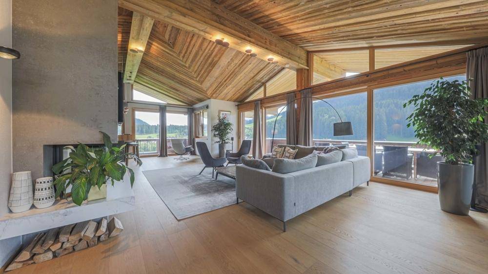 In herrlicher Panoramalage ist diese Neubauvilla auf einem sonnigen ca. 777 m² großen Grundstück in leichter Hanglage von Kirchberg in Tirol soeben errichtet worden. Der weitläufige Fernblick reicht bis hin zum Kitzbüheler Horn, die Fleckalm sowie den Rettenstein aber auch die strategisch ideale Lage der Villa überzeugt, da zahlreiche Skilifte und Pisten sich in unmittelbarer Nähre befinden. Im Erdgeschoss der Villa stellen Sie Ihr Auto in der Garage ab und treten in die großzügige Diele mit Freitreppe ein, welche alle drei Schlafzimmer mit einander verbindet. Luxuriöse Badezimmer befinden sich en suite zu jedem Schlafzimmer. Ein großer Balkon, welcher von beiden Richtung Osten ausgerichteten Schlafzimmern erreichbar ist, ladet ein das gebotene Bergpanorama zu genießen. Ein eleganter Glaslift verbindet die 3 Geschosse miteinander und macht das Objekt barrierefrei benutzbar. Das Masterschlafzimmer mit Ankleide und Bad, blickt Richtung Süden und verfügt nicht nur über einen Balkon sondern auch über eine Terrasse. Im Dachgeschoss erstreckt sich der ca. 90 m² große Richtung Norden, Osten und Süden ausgerichtete Wohn-Essbereich mit schöner Sicht auf den Altholz-Dachstuhl. Großzügige Fensterflächen sorgen für einen lichtdurchfluteten Wohnbereich, welcher von zwei Dachterrassen und einem Balkon umschlossen wird. Im Untergeschoss der Villa befinden sich zwei weitere Schlafzimmer mit Badezimmern en suite, ein Wirtschaftsraum und ein ca. 48 m² großer Wellnessbereich mit vorbereiteter Sauna, Whirlpool, Dusche und seperatem WC. Die großzügige Terrasse mit der Möglichkeit auf ein Außenpool lädt ein, es sich hier gemütlich zu machen. Das Chalet ist ein gelungener Mix aus Tiroler Bauweise und hochmoderner Architektur, welche sich perfekt in die Landschaft einfügt. Das Objekt ist gerade in Fertigstellung, das heißt dass das Chalet soeben überdurchschnittlich exklusiv möbliert wird. Das Haus wird komplett fertiggestellt, mit hochwertigen Sanitärgegenständen, voll ausgestatteter Küche sowie allen Wohn-Schlafelementen, die für einen nahtlosen Einzug in das Haus benötigt werden. Energiedaten in Arbeit. Sofort verfügbar. Über unseren virtuellen 3D-Rundgang: Als erster und einziger Makler Kitzbühels, bieten wir Ihnen die Möglichkeit sich von zuhause aus einen virtuellen Überblick über das gesamte Objekt zu verschaffen. Scannen Sie mit Ihrem Smartphone den qrcode vom Startbild und Sie gelangen direkt zu einem 1:1 Rundgang durch die Immobilie. Durch Klicken auf einen beliebigen Bereich im Rundgang können Sie sich komplett frei durch das Objekt bewegen und sich jeden Raum und jedes Detail ansehen. Haben Sie den Rundgang geöffnet, befinden sich im linken unteren Bildschirmrand einige Symbole. Hier können Sie sich das gesamte Objekt entweder als 3D-Modell im Stil eines „Puppenhauses“ darstellen lassen oder sich den Grundriss jeder Etage ansehen. Weiters gelangen Sie hier direkt zu den Highlights in der Immobilie.