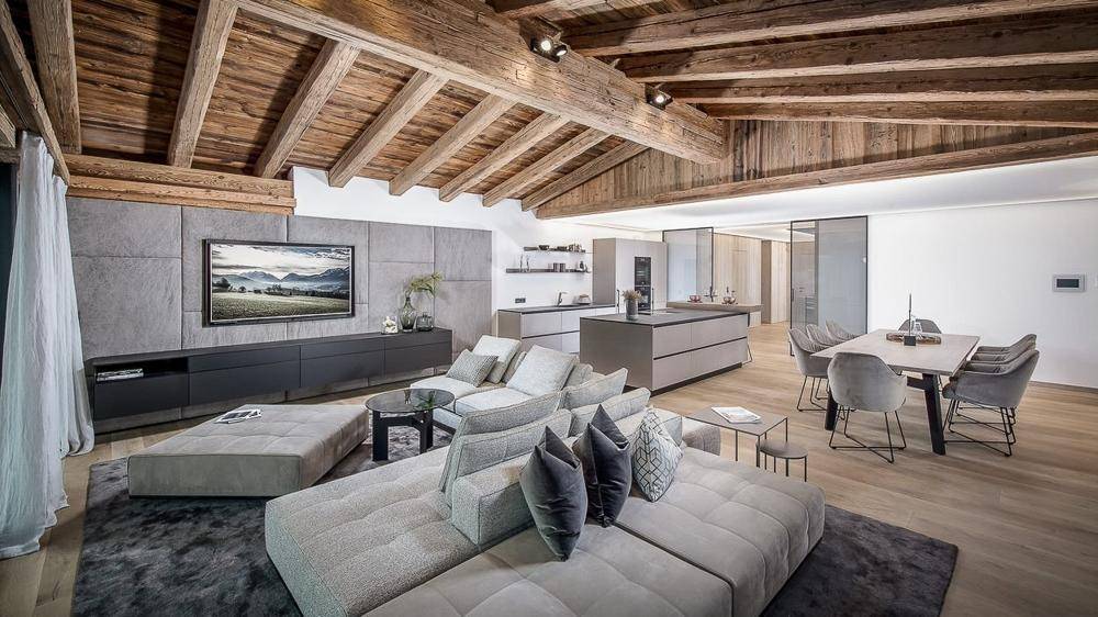 Insgesamt befinden sich nur fünf Einheiten über vier Etagen im Projekt “Gaisberg”. Vor allem Stil, heimische Handwerkskunst und modernes Design wurde bei diesem Objekt perfekt miteinander umgesetzt. Die großzügigen Panoramafenster bieten nicht nur einen fantastischen Fernblick bis aufs Kitzbüheler Horn und den Rettenstein sondern sorgen im Inneren für ein Wohngefühl, das seines gleichen sucht. So bringen Luxus und Komfort diese Wohnungen auf einen neuen Level und die Liebe zum Detail verleiht jeder einzelnen Wohnung die spezielle Atmosphäre, welche bereits im Eingangsbereich ihre Kraft entfaltet. Neuester Stand der Technik, Bussystem mit aussergewöhnlichen Lichteffekten, kontrollierte Wohnraumbelüftung aber auch sonstige extravagante Details sind beeindruckend. Strategisch gesehen ist die Lage am Gaisberg kaum zu übertreffen, denn Sie steigen bequem direkt vor Ihrer Haustüre in den Skilift ein. Sollte Ihnen der Gaisberg nicht genügen, so können Sie direkt vom Haus weg eine Station mit dem Skibus zum Maierllift fahren und gelangen sodann ins Kitzbüheler Skigebiet. Sie lassen Ihr Auto bequem in der Tiefgarage vor Ihrem Eingangsbereich, wo sich drei Abstellplätze befinden stehen und gelangen sodann direkt in das elegante Foyer der Luxus-Wohnung. Hier verfügt das Apartment über eine Garderobe und einen Kellerraum. Entweder mit dem Lift oder über das großzügige Stiegenhaus gelangen Sie ins Erdgeschoss, wo Ihnen sofort der exklusive Wellnessbereich mit eigener Sauna, Dusche, WC und Ruheraum ins Auge sticht. Der offene Wohnbereich mit Kochinsel und Essecke laden ein es sich hier gemütlich zu machen. Ein Gaskamin sorgt für das heimeliges Wohngefühl, welches durch den Sichtdachstuhl noch aufgewertet wird. Zwei Schlafzimmer mit Bad en suite als auch die ca. 45 m² Richtung Osten ausgerichtet Terrasse vervollständigen diese Etage. Das Dachgeschoss ist ebenfalls mit dem Lift oder übers Stiegenhaus zu erreichen und verbindet Schlafen und Arbeiten miteinander. So steht hier ein eigenes Büro als auch im Anschluss das Masterschlafzimmer mit Badezimmer en suite zu Verfügung. Für das gewisse Etwas sorgt die ca. 48 m² Terrasse, auf die sogar noch in den Abendstunde die Sonne scheint. Energiedaten: HWB Klasse A 16,7 fGEE Klasse A++ 0,49 Über unseren virtuellen 3D-Rundgang: Als erster und einziger Makler Kitzbühels, bieten wir Ihnen die Möglichkeit sich von zuhause aus einen virtuellen Überblick über das gesamte Objekt zu verschaffen. Scannen Sie mit Ihrem Smartphone den qrcode vom Startbild und Sie gelangen direkt zu einem 1:1 Rundgang durch die Immobilie. Durch Klicken auf einen beliebigen Bereich im Rundgang können Sie sich komplett frei durch das Objekt bewegen und sich jeden Raum und jedes Detail ansehen. Haben Sie den Rundgang geöffnet, befinden sich im linken unteren Bildschirmrand einige Symbole. Hier können Sie sich das gesamte Objekt entweder als 3D-Modell im Stil eines „Puppenhauses“ darstellen lassen oder sich den Grundriss jeder Etage ansehen. Weiters gelangen Sie hier direkt zu den Highlights in der Immobilie.