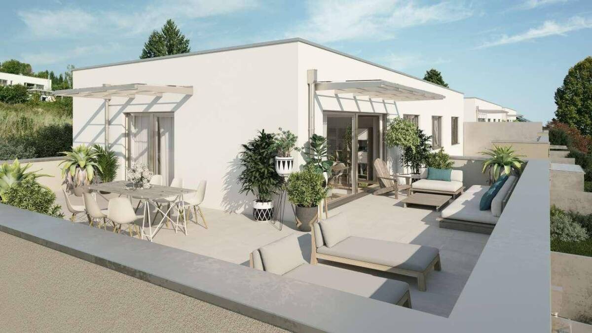 In absoluter Ruhelage in einer Seitenstraße am Kehlberg errichtet die Firma BEWO ein exklusives Wohnprojekt mit nur 9 hochwertigen Neubau-Wohnungen mit großzügigen Terrassen und teilweise Eigengärten! Genießen Sie den einzigartigen Wohnkomfort, die idyllische Lage und den traumhaften Blick ins GrüneÜbrigens: Sie können bei jeder Wohnung aus 2 Grundriss-Varianten die für Ihre Bedürfnisse optimale Version wählen! Die Dachterrassen-Wohnung Top 7 liegt im 1. Obergeschoss und ist als 3-Zimmer oder 4-Zimmer Wohnung verfügbar:Raumaufteilung 3-Zimmer Variante (107,08 m2): Vom Vorraum aus gelangen Sie in in eine großzügige, ca. 47 m2 große Wohnküche, zwei Schlafzimmer, ein Bad mit Badewanne, Dusche (mit Abflussrinne), Doppelwaschbecken und Fenster, ein separates WC mit Handwaschbecken sowie in einen Abstellraum.Raumaufteilung 3-Zimmer Variante (106,46 m2): Hier gelangen Sie vom Vorraum aus in eine ca. 35 m2 große Wohnküche, drei Schlafzimmer, ein Bad mit Badewanne, Dusche (mit Abflussrinne), Doppelwaschbecken und Fenster, ein separates WC mit Handwaschbecken sowie in einen Abstellraum. Die großzügige, ca. 58,75 m2 große südwest-seitige Dachterrasse ist vom Wohn/Ess-Bereich aus begehbar. Sämtliche Terrassen der Wohnanlage sind mit Sichtschutzelementen ausgestattet, Privatsphäre ist somit garantiert. Der Wohnung ist ein großzügiges Kellerabteil mit 5,13 m² zugeordnet, 1 bis 2 Carportplätze können zusätzlich erworben werden. Das Besondere auf einen Blick: • BAUSTART BEREITS ERFOLGT!• exklusive, ruhige Lage "Wohnen bei den Weingärten"• wunderschöner Ausblick in traumhafte Umgebung• Raumhöhe 2,60 m• Luftwärmepumpe - einzelraumgeregelte Fußbodenheizung• durchdachte, variable Grundrisse• großzügige, 3-fach verglaste Fensterelemente• hochwertige Sanitärausstattung, Marken Duravit und Hansgrohe• großzügige Terrassenflächen, je nach Wohnung mit schönem Gartenanteil• Sichtschutz zwischen den einzelnen Gartenanteilen und Terrassen• digitale Haus-Satellitenanlage• 12 Carportplätze• große Anzahl an überdachten Fahrradabstellplätzen• HWB 42,3 kWh/m2a, fGEE 0,71• provisionsfreier Verkauf direkt vom Bauträger! Details Lage: Kehlberg, Graz StraßgangArt: Kleinwohnanlage mit 9 EigentumswohnungenBauart: MassivbauweiseWohnungsgröße: 2-, 3-, 4- Zimmer von ca. 65 m2 bis ca. 108 m2Ausstattung: hochwertigBeziehbar ab: Sommer 2021 Vereinbaren Sie schon jetzt Ihren Beratungstermin! Weitere interessante Eigentums- und Mietobjekte finden Sie auf unserer Homepage - www.bewo.atWir freuen uns auf Ihren Besuch!