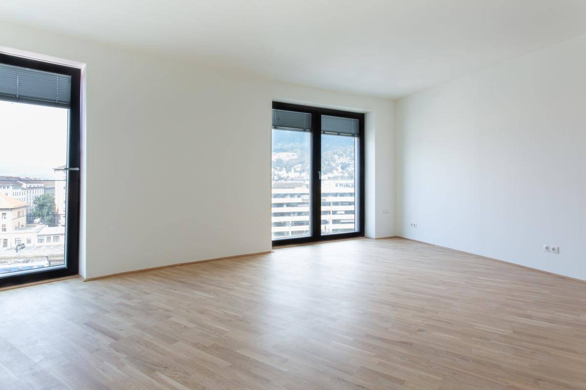 Die Wohnung im 6.Stock bietet einen großen Wohn- Kochbereich mit einem modernen Style und bodentiefen Fenstern. Beide Zimmer haben eine leicht abgerundete Form und begeistern mit einem tollen Ausblick auf die Stadt. Durch die großen Fensterfronten gelangt viel Licht in die Wohnung. Alle Fenster sind mit elektrischen Jalousien ausgestattet. Neben dem großen Wohnzimmer mit Küchenbereich liegt das Schlafzimmer, welches, wie die gesamte Wohnung, mit einem Eichenparkettboden ausgestattet ist. Das schöne Badezimmer mit Infinity-Dusche, ein separat gehaltenes WC und ein Abstellraum sind ebenfalls vom Vorraum aus erreichbar. Vom Hauseingangsbereich und der Tiefgarage aus gelangt man bequem mit dem Personenaufzug direkt vor die Wohnungstür. Es handelt sich bei den angegebenen Preisen um Nettopreise/Anlegerpreise! Der Preis für einen Tiefgaragenstellplatz beträgt € 28.000. Überzeugen Sie sich selbst und vereinbaren Sie einen Besichtigungstermin.