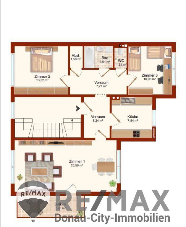 "Nähe Bahnhof -SUPER LAGE" Die Lage ist perfekt, nicht weit vom Bahnhof und trotzdem ruhig. Im ersten Stock einer kleinen Wohnhausanlage befindet sich diese drei Zimmerwohnung mit Balkon. Die Aufteilung ist ideal: geräumiges Vorzimmer mit Einbauschränken, Küche, großes Wohnzimmer, zwei Schlafzimmer, Bad mit Wanne, WC und Abstellraum. Die Wohnfläche beträgt ca. 77 m² + 7 m² Balkon. Die Wohnung ist nicht eingerichtet (außer Küche). Beheizt wird mit eigener Gastherme. Ein überdachter Autoabstellplatz und ein Kellerabteil gehören auch zu dieser Eigentumswohnung. Nähere Informationen zu Tulln erhalten Sie auf www.tulln.at Preis NUR € 210.000,-- Finanzierungsvorschlag: Eigenmittel ca. € 31.500,--/monatlich € 893,--Angaben gemäß gesetzlichem Erfordernis: Heizwärmebedarf: 144.0 kWh/(m²a) Klasse Heizwärmebedarf: D Faktor Gesamtenergieeffizienz: 2.29 Klasse Faktor Gesamtenergieeffizienz: D Durchschnittliche Vermarktungszeit: 80 Tage Erzielter Preis 97% vom Angebotspreis! Testen Sie uns! Wir erweitern unser Team! Bewerben Sie sich jetzt! Ihre-Karriere-als-Immobilienprofi bei RE/MAX Donau-City-Immobilien!