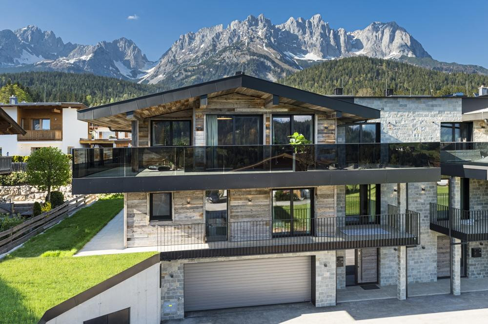 Diese Luxusimmobilie liegt am Fuße des Wilden Kaisers in absoluter Sonnenlage und wird voll möbliert, mit exclusiver Designerausstattung verkauft. Die Aussenansicht ist modern gestaltet, aber für den Innenausbau wurden traditionelle Materialien verwendet. Obwohl mit dem Nachbarhaus baulich verbunden, befindet sich jedes Chalet auf einem eigenen Grundstück, wodurch eine sehr gute Bebaungsmöglichkeit gegeben war. Die Wohnfläche erstreckt sich über drei Etagen, wobei sich im Souterrain ein Schlafzimmer mit eigenem Badezimmer befindet, sowie der Wirtschaftsraum und die Doppelgarage. Über das Treppenhaus oder den Personenlift gelangt man in die beiden oberen Stockwerke. Ebenerdig sind drei Schlafzimmer mit drei Bädern angeordnet, wobei das Hauptschlafzimmer mit eigenem Ankleideraum punkten kann. Von den Schlafzimmern hat man direkten Zugang in den Garten bzw. auf die Terrasse. Im Dachgeschoss, unter einem wunderbaren Alt(Antik)holz-Sichtdachstuhl, befindet sich der großzügige Wohn- Eßbereich mit offenem Kamin. Als zusätzliches Highlight muss die moderne ausgestattete Designerküche erwähnt werden. Eine überdachte Loggia und der südseitig ausgerichtete Balkon laden zum Verweilen und zum Genießen im Freien ein. Eine Luxus-Immobilie in Bestlage, mit Weitblick, Sonne und viel Ruhe.