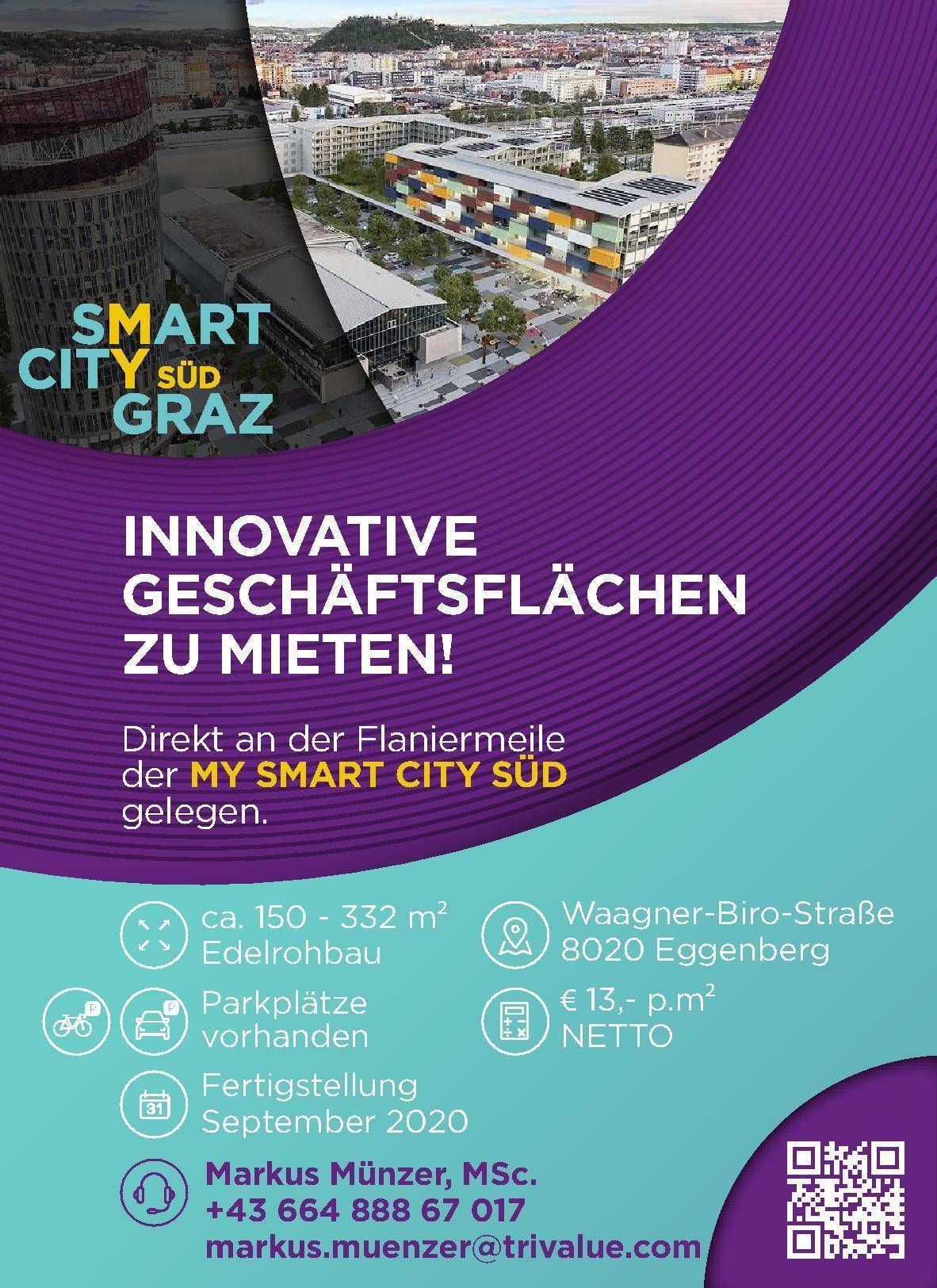 Trendy Geschäftsflächen in einem ausgefallenen und innovativen Gebäude zu vermieten! Sie sind auf der Suche nach einer Geschäftsfläche? Dann sind Sie bei der Smart City Süd genau richtig! Die einzelnen Baukörper lassen bereits schon erkennen, welch‘ Meilenstein für die smarte Stadtentwicklung gelegt wurde. Auf einen Blick: • Geschäftsflächen von ca. 150 bis 332 m² • Mietpreis EUR 13,-- netto/m² • Edelrohbau, gerne begleiten wir unsere Kunden beim Ausbau • Mieteinheiten nach Bedarf kombinierbar • Parkplätze vorhanden • Fahrradabstellplätze vorhanden • Fertigstellung: September 2020 • Straßenbahnverlängerung bis Ende 2021 Die Kleider eines Hauses! Mit der Fassade zeigt ein Gebäude der Öffentlichkeit sein Gesicht. Kleider machen Leute. Hüllen machen Gebäude. Funktion und Emotion gehen dabei Hand in Hand. Durch seine bunte, auffallende Fassade, bestehend aus 78 gestapelten Schiffscontainern, ist die Smart City Süd genau der Ort, an dem man mit einem Unternehmen erfolgreich durchstartet! Für weiterführende Informationen: Markus Münzer, MSc. +43 664 888 67 017 markus.muenzer@trivalue.com