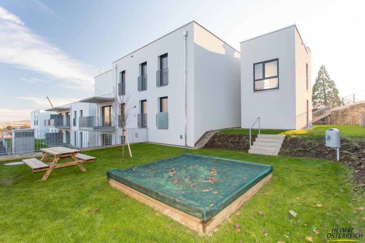 Das Gebäude wird in Massivbauweise mit zwei Voll-, einem Staffel- und einem Garagengeschoß ausgeführt und passt sich so der gegebenen Hanglage an. Durch Zäsuren, Vor- und Rücksprünge wird das Objekt in kleinere Baukörper unterteilt und fügt sich so harmonisch in seine Umgebungsstruktur ein.Erschlossen wird das Gebäude über ein zentrales, barrierefrei ausgeführtes Stiegenhaus mitAufzugsanlage - wobei sich der Eingang im ebenerdigen Garagenniveau befindet. Als zweiter Fluchtweg dient das an der Gebäuderückseite situierte Nebenstiegenhaus, das ebenfalls mit einer Aufzugsanlage ausgestattet wird.Die Wohnungen im Erdgeschoß verfügen jeweils über großzügige Terrassen mit vorgelagerten Eigengärten, die über Stiegenanlagen und zusätzlichen Zugangsweg erreichbar sind. Darüber liegend sind alle Wohnungen im 1. und 2. Obergeschoß jeweils mit Balkon bzw. Loggia oder Dachterrasse ausgestattet.Alle Wohnungen werden barrierefrei bzw. durch Entfernen der Trockenbauwand zwischen Bad und WC barrierefrei adaptierbar ausgeführt.Die Beheizung erfolgt mittels Fernwärmeanschluss aus dem Netz der EVN.In der Tiefgarage sind PKW-Stellplätze sowie Fahrradeinstellmöglichkeit untergebracht.Infrastruktur / EntfernungenGesundheit Arzt <1.175m Apotheke <1.300m Klinik <1.975m Krankenhaus <875m Kinder & Schulen Schule <250m Kindergarten <975m Universität <1.600m Höhere Schule <1.125m Nahversorgung Supermarkt <275m Bäckerei <1.000m Einkaufszentrum <225m Sonstige Geldautomat <775m Bank <400m Post <1.275m Polizei <1.025m Verkehr Bus <250m Autobahnanschluss <450m Bahnhof <1.600m Flughafen <3.200m Angaben Entfernung Luftlinie / Quelle: OpenStreetMap