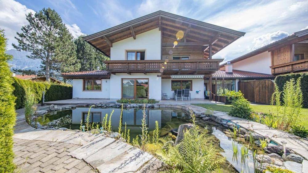Dieses gediegene Einfamilienhaus liegt in Ellmau am Wilden Kaiser in einer Sackgasse und bietet neben Ruhe und Sonne auch einen weitläufigen Fernblick auf den gesamten Wilden Kaiser, die Loferer Steinberge bis hin zum Kitzbüheler Horn. Das Ortszentrum sowie alle wichtigen Nahversorger sind zu Fuß in nur 10 Minuten zu erreichen. Das Haus steht auf einem ca. 581 m² großen Grundstück und bietet eine Wohnnutzfläche von ca. 341 m². Im Erdgeschoss gelangen Sie durch die großzügige Diele in den Wohnbereich des Hauses. Fast alle Decken sind in Altholz ausgeführt, im Essbereich mit schönem Sichtdachstuhl. Der Wohnbereich teilt sich in eine Küche mit Bar, dem davor befindlichen Esstisch, einer Essecke mit Blick auf den Wilden Kaiser und den zentral angeordneten Kamin auf und überzeugt vor allem durch die Glasfronten, welche nicht nur für eine ideale Belichtung sorgen, sondern auch einen fantastischen Ausblick auf die umliegende Bergwelt bieten. Weiters verfügt das Haus im Erdgeschoss über einen Wintergarten, einen eigenen Wellnessbereich mit Fußbodenheizung, Dampfbad, Sauna und großer Dusche. Der ca. 388 m² große Garten wurde liebevoll gestaltet und bietet dem zukünftigen Eigentümer ein fast uneinsichtigen Rückzugbereich. Im Sommer sorgt der Gartenteich für eine frische Abkühlung. Eine Außendusche (kalt/warm) sowie ein Gartenhaus sind ebenfalls vorhanden. Im Dachgeschoss befinden sich vier Schlafzimmer, welche sich ein großzügiges Badezimmer mit Dusche, Badewanne und WC teilen. Ein separates WC ist ebenfalls vorhanden. Eine überdachte Terrasse und ein Balkon befinden sich auch auf dieser Etage. Das Untergeschoss besteht aus einem Abstellraum, dem Technikraum und zwei riesigen Freizeiträumen mit Fußbodenheizung, welche der neue Besitzer nach seinen Vorstellungen frei gestalten kann. Eine Garage sowie 2-3 Freistellplätze befinden sich vor dem Haus. Von der Garage gelangt man direkt in die Diele des Hauses, weiters besteht ein Durchgang in den Garten. Im Wohn und Essbereich befinden sich zwei Kachelöfen (Grundöfen), welche dem Raum ein angenehmes Wohlfühlklima verschaffen. Energiedaten in Arbeit.