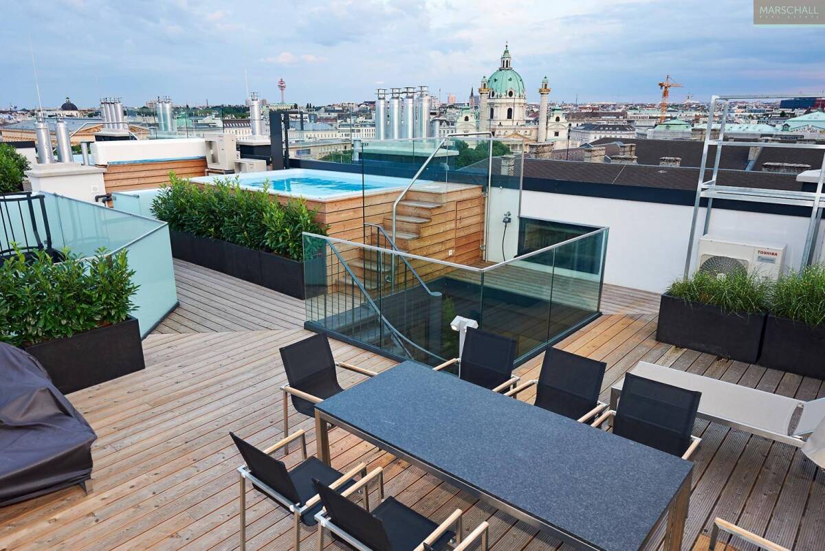 LAGE Dieses 288 m² große Penthouse befindet sich in einem herrschaftlichen Ringstraßenhaus in unmittelbarer Nähe zur Wiener Staatsoper. RAUMAUFTEILUNG Die Wohnung verfügt auf der ersten Ebene über 3 Schlafzimmer, jeweils mit angeschlossenem Bad und direkt angeschlossener Garderobe. Über eine großzügig angelegte Treppe gelangen sie vom Eingangsbereich in die 85 m² große Wohn- Essebene. Besonders hervorzuheben sind die großflächigen Panoramaverglasungen, welche einen unverbaubaren Fernblick auf den Karlsplatz und die Stadt bieten. Das Highlight dieser Wohnung ist die ca. 100 m² große Dachterrasse mit Rundumblick, Pool und Outdoorküche. AUSSTATTUNG • Wohnungsinterner Lift • Swimmingpool mit Aussicht über den Karlsplatz • 150 m² Terrassen auf 3 Ebenen • Panikraum mit Notstromversorgung • Fußbodenheizung • Deckenkühlung • Sauna INFRASTRUKTUR In unmittelbarer Nähe befindet sich die Wiener Staatsoper, in welcher jährlich der weltberühmte Wiener Opernball gefeiert wird, sowie der Musikverein, welcher Austragungsort des Neujahrskonzerts ist. Der Naschmarkt und kulturelle Institutionen wie die Albertina sind bequem zu Fuß zu erreichen. Die Stationen der U-Bahn Linien U4 und U1, sowie zahlreiche Autobus-Linien befinden sich 120m Meter entfernt. Diverse Geschäfte, Supermärkte und Gastronomiebetriebe befinden sich in unmittelbarer Umgebung. INFORMATION Provision: 3 % + 20 % USt Ein Garagenplatz steht um EUR 70.000,00 zur Verfügung.Wir weisen darauf hin, dass zwischen dem Vermittler und dem Auftraggeber ein wirtschaftliches Naheverhältnis besteht. Der Vermittler ist als Doppelmakler tätig.