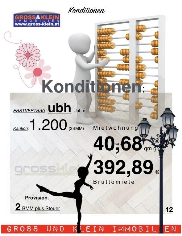 Süßes Kleinod Bruttomiete 392,89 EUR im Zentrum von Feldkirchen OMG - alles was man braucht - und ne Traumlage dazu . Die Wohnung liegt im Dachgeschoß eines denkmalgeschützten Gebäudes und besteht aus folgenden Räumlichkeiten. :-) zentraler Vorraum :-) Leben - Wohnzimmer mit Wohnküche :-) Schlafzimmer :-) Bad mit Dusche & Toilette Die Einteilung sorgt für gediegenes Wohnen. Hier hat alles schön Platz. Die Lage ist als ideal - direkt am Hauptplatz gelegen sorgt es für Freude auf der einen Seite und auf der anderen Seite erfreut man sich über die lokale und nahversorgende Infrastruktur. Frau Martina Hödl - gerne unter 0650 55 55 789 - für Sie erreichbar - führt gerne mit Ihnen Besichtungen durch und beantwortet Ihre Fragen . in der Kürze .... Größe :ca. 40,68 qm Lage:Hauptplatz / DG / natürlich mit Lift Bruttomiete:392,89 EUR inkl Betriebskosten und Steuern Kaution:3 Bruttomieten Provision:2 Bruttomieten + Steuern Energiewert:115 kWh, Klasse „C“