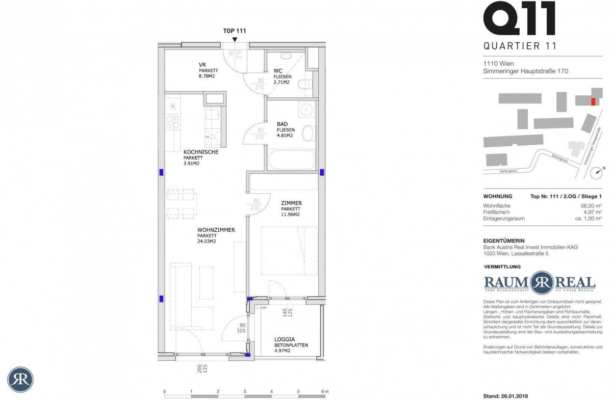 Die Wohnungen im QUARTIER 11 zeichnen sich durch eine Vielfalt an unterschiedlichen Grundrissen und Größen von 43 bis 100 m2 aus. Wählen Sie das Wohnungslayout, das am besten zu Ihnen und Ihrer Zukunftsplanung passt. Ob 1-, 2-, 3- oder 4-Zimmer-Wohnung – alle Wohnbereiche sind bis ins Detail geplant. Jede Wohnung verfügt entweder über Garten, Balkon, Loggia oder Terrasse. Wir haben alle Wohnungen mit modernsten Maßküchen inklusive Geräten, Parkettböden und alle Fenster mit Außenjalousien ausgestattet. Und das Beste ist: alle Wohnungen sind gekühlt.Detaillierte Infos über alle freien Wohnungen sowie Pläne finden Sie unter www.QUARTIER11.at.!!! Alle Innenaufnahmen sind Beispielfotos aus Wohnungen in diesem Projekt.Das Wohnareal QUARTIER 11 besteht aus 8 freistehenden Gebäuden und einem 10-geschoßigen Turm mit markanter Fassade. Großzügige Grünflächen und freundlich gestaltete Plätze verleihen diesem Wohnprojekt ein ganz besonderes Flair in Ruhelage. Die moderne Architektur kombiniert hier attraktives Design und angenehmes Wohngefühl für Ihr neues Zuhause.Das innovative Energiesystem KlimaLoop® mit seiner integrierten Deckenkühlung für alle Wohnungen setzt dabei neue Standards und sorgt für niedrige Energiekosten.Mietdauer: 10 Jahre befristet Kaution: 3 Bruttomonatsmieten Provision: 2 Monatsmieten + 20 % Ust. Garage: € 72,--/Monat (Kaution für Garage: € 220,--)Schicken Sie uns bitte eine Anfrage per Mail. Es werden nur Anfragen mit kompletter Namensnennung (Vor- und Zuname) sowie Telefonnummer beantwortet.Nach Erhalt Ihrer Anfrage übermitteln wir Ihnen das Angebot und können dann gerne eine Besichtigung vereinbaren.Bitte beachten Sie, dass bei Wohnungen, die erst frei werden, eine Besichtigung nur in Abstimmung mit dem/der derzeitigen Mieter/in stattfinden kann.Infrastruktur / EntfernungenGesundheit Arzt <2.000m Apotheke <500m Klinik <4.500m Krankenhaus <4.000m Kinder & Schulen Schule <500m Kindergarten <500m Universität <3.000m Höhere Schule <3.500m Nahversorgung Supermarkt <500m Bäckerei <1.000m Einkaufszentrum <1.500m Sonstige Bank <1.000m Geldautomat <1.000m Post <1.000m Polizei <500m Verkehr Bus <500m U-Bahn <1.000m Straßenbahn <500m Bahnhof <1.000m Autobahnanschluss <2.500m Angaben Entfernung Luftlinie / Quelle: OpenStreetMap