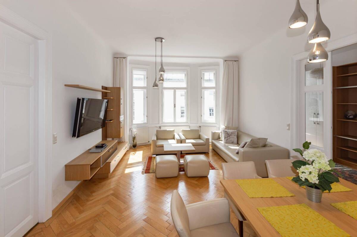 Die stilvolle Altbauwohnung mit Balkon bietet voll möbliert in ruhiger Lage ein ausgezeichnetes Wohngefühl zwischen der lebendigen Wiener Innenstadt und dem Erholungsgebiet des Donaukanals und Praters. Schon beim Betreten des repräsentativen Altbaus beeindruckt das herrschaftliche Entrée mit seinen zahlreichen Stuck- und Stilelementen. Ein Lift führt zur großzügigen Wohnung in den zweiten Stock. Der hochwertige Fischgrätparkettboden, Doppelflügeltüren, große Kastenfenster und die beeindruckende Raumhöhe sorgen in der gesamten Wohnung für ein elegantes Ambiente. Der geräumige Grundriss bietet ein großzügiges Vorzimmer mit Klopfbalkon, einen prachtvollen Wohnbereich mit schönem Erker, eine mit Markengeräten voll ausgestattete Küche mit Frühstücksecke, ein Masterbedroom mit Balkon, ein Kabinett als zweites Schlaf-, Gäste- oder Arbeitszimmer, ein luxuriöses Tageslicht-Badezimmer mit Doppelwaschtisch, großer Regendusche, Bidet, Waschmaschine sowie Wäschetrockner, ein separates WC und einen praktischen Abstellraum. Die erstklassige Ausstattung umfasst das komplette hochwertige Mobiliar sowie eine Klimaanlage und Sonnenschutz. Der West-Balkon bietet einen besonderen Ausblick, hinweg über einige grüne Baumkronen bis hin zum berühmten Hundertwasserhaus. Die monatliche Gesamtmiete beträgt EUR 2.443,80 (Miete netto EUR 2.000,-- + BK EUR 221,64 + USt EUR 222,16). Als Kaution sind 3 Bruttomonatsmieten zu hinterlegen. Die Wohnung wird auf 1 Jahr mit Option auf Verlängerung befristet vermietet und kann als Zweit-/Ferien-Wohnsitz genutzt werden (kein Hauptwohnsitz).