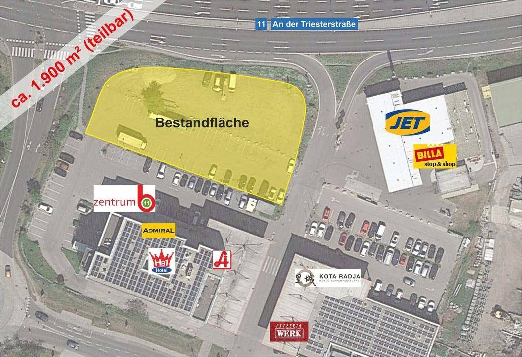 Die Liegenschaft befindet sich im Süden von Wien, im Industriezentrum Niederösterreich Süd, direkt an der B11 und in unmittelbarer Die ca. 1.900 m² große (teilbare) Bestandfläche zeichnet sich vor allem durch ihre sehr gute Verkehrserschließung (direkte Ein- und Ausfahrt von der B11, Zufahrt von der Straße 3), die optimale Verkehrsanbindung (B17, A2, A21, A23, S1, ...) sowie die hohe Ver-kehrsfrequenz (rund 30.000 KFZ/24h) aus. In direkter Nachbarschaft befinden sich eine JET Tankstelle mit Billa-Shop, das HB1 Businesshotel, die Apotheke „WIENEU“ - eine der modernsten Apotheken Österreichs, das Kota Radja Wokrestaurant, eine Pizzeria mit Lieferservice, ein Café für Sportwetten sowie nationale/internationale Büromieter. Mietdauer: langfristiger Bestand-/Baurechtsvertrag